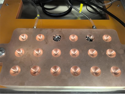 | 在 18 工位水冷铜坩埚中进行金属熔炼,可一次性熔炼 18 个金属样品,并且保证熔炼过程样品无交叉污染(铜坩埚工位数可依客户需求定制) 4mm 直径的水冷钨电极安装在机械臂运动机构上。